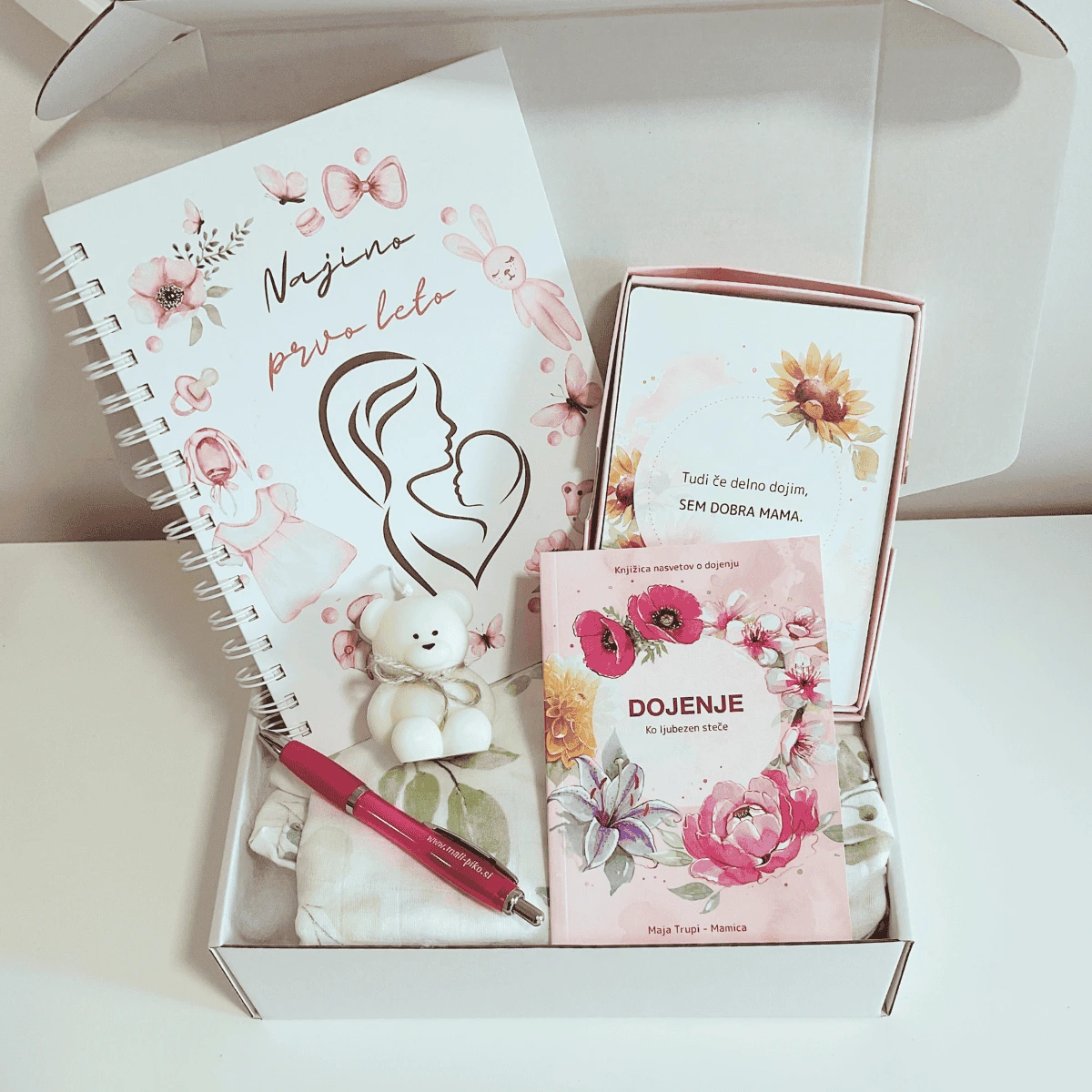Darilni set Prvi trenutki ljubezni je skrbno sestavljen paketek nežnosti, topline in podpore za mamico in njenega novorojenčka.