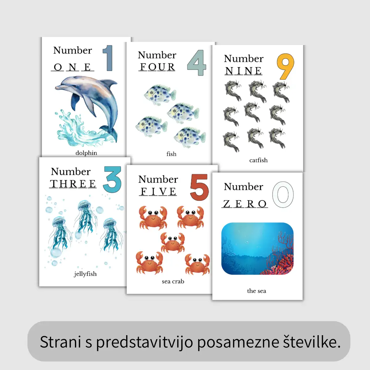 🌊 Učenje številk v angleščini še nikoli ni bilo tako zabavno! Ta delovni zvezek otroka popelje med morske živali, kjer skozi igro vadi pisanje in izgovorjavo števil od 0 do 10.