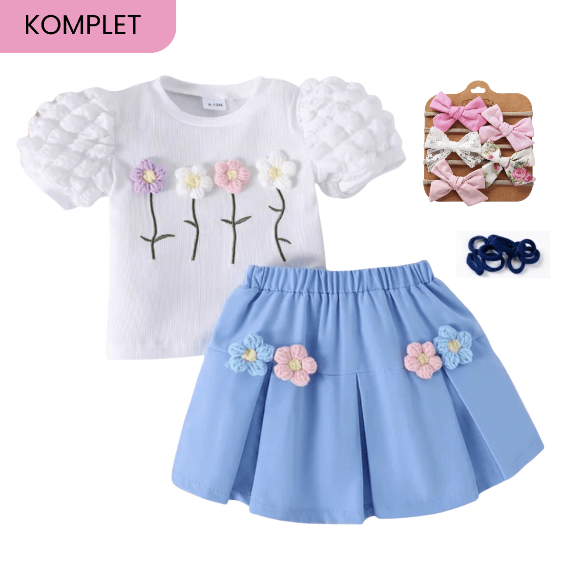 Prisrčen poletni komplet za punčke vključuje: